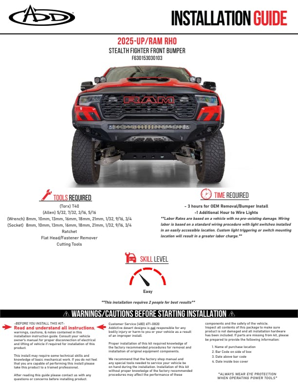 The 2025 Ram RHO Stealth Fighter Front Bumper combines aggressive style with full OEM sensor and light retention. It supports a 40" radius light bar or ten pod lights in the center, plus a pod light on each side. Heavy-duty D-ring clevis mounts come standard, with an optional winch mount available. Built tough with a hammer black powder coat and satin black panels, this direct-fit bumper is proudly made in the USA.