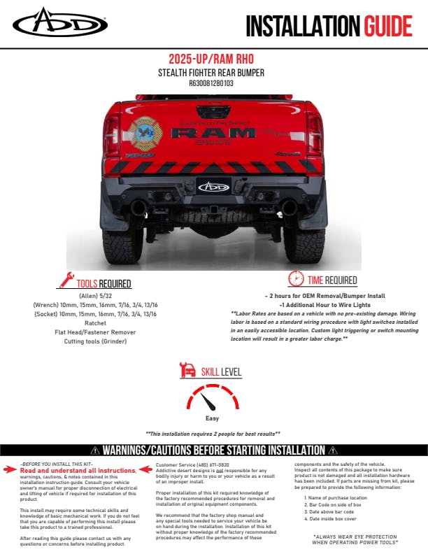Upgrade your Ram RHO with aggressive styling and unmatched functionality. The Stealth Fighter Rear Bumper features integrated cube light mounts, heavy-duty 1" D-ring clevis mounts, and full compatibility with OEM parking sensors and driver assist systems. Finished in a durable hammer black powder coat with satin black panels, it installs easily with supplied hardware and is proudly made in the USA.