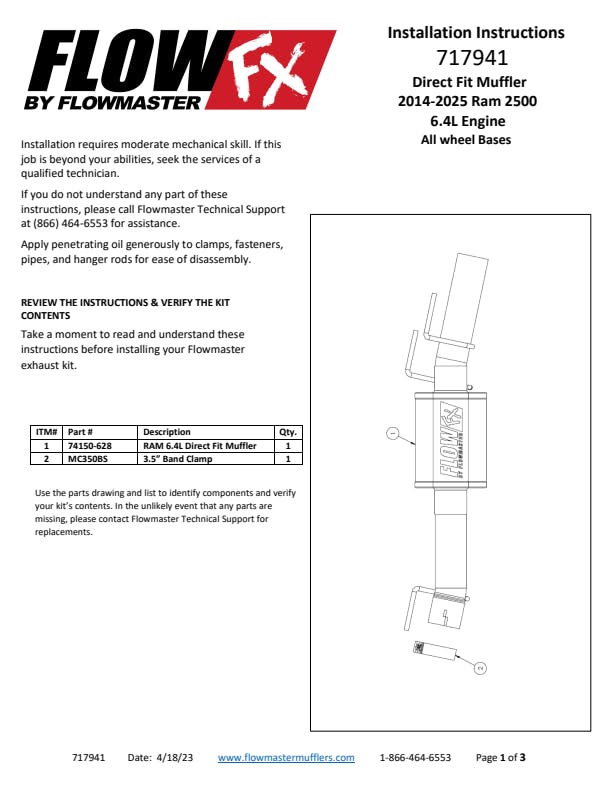 Flowmaster's® FlowFX Direct-Fit Muffler exhaust system for the 2014-2025 RAM 2500/3500 trucks with the 6.4L HEMI engine gives you a great value packed way to help you customize your RAM truck to your personality. This performance muffler system fits both 2/4 Wheel drive models and is manufactured from 409 stainless steel for years of trouble-free service and performance. Features include a 3.50-inch inlet pipe leading into a 409 stainless steel Flow FX series "straight-through" muffler for great sound and maximum performance and no drone. The muffler then connects to the factory tailpipe for a simple and effective performance upgrade. Max dyno gains of 13 hp and 11 lb-ft at the rear wheels. This results in better acceleration and towing performance. The system uses all the factory hanger locations and connections for an easy installation that you can do at home. Kits include installation instructions and all necessary hardware. Backed by Flowmaster's Lifetime Limited Warranty.