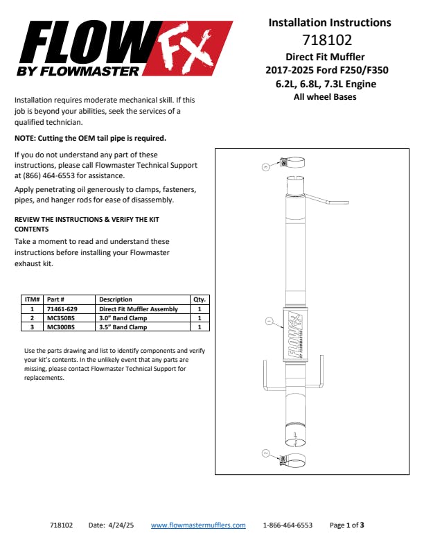 Flowmaster's® FlowFX Direct-Fit Muffler exhaust system for the 2017-2026 Ford F250/F350 Super Duty trucks with the 6.2L, 6.8L and 7.3L gas engines gives you a great value packed way to help you customize your Ford truck to your personality. This performance muffler system fits both 2/4 Wheel drive models and is manufactured from 409 stainless steel for years of trouble-free service and performance. Features include a 3.50-inch inlet pipe leading into a 409 stainless steel Flow FX series "straight-through" muffler for great sound and maximum performance. The muffler then connects to the factory tailpipe for a simple and effective performance upgrade. Max dyno gains of 12 hp and 11 lb-ft at the rear wheels delivers power you can feel. This results in better acceleration and towing performance. The system uses all the factory hanger locations and connections for an easy installation that you can do at home. Kits include installation instructions and all necessary hardware. Backed by Flowmaster's Lifetime Limited Warranty.