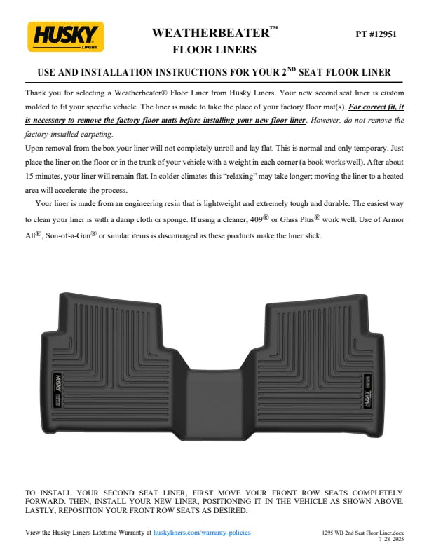 - WeatherBeater(TM) Liners offer protection that extends all the way to your rear seats. So go ahead, lift the seats and leave them up, load after load. Husky's got your floors, and your back, no matter what the road brings your way.