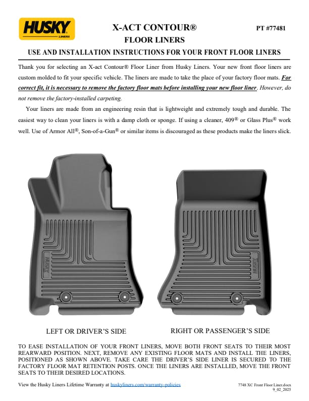 Nothing fits your vehicle better or protects longer than Husky X-act Contour?. These liners combine laser-scanned, exact fit with a no-slip, DuraGrip surface and a softer feel. Plus, the rock-solid stability delivered by your vehicle's factory retention posts, and our StayPut Nibs for a no-slip, no-slide, surface with absolutely zero compromise in protection. They're built to stand up to whatever you're laying down? including chemicals like battery acid and oil, with our FormFit Edge? to keep whatever spills contained for easy cleanup. Available in black. Built for a lifetime of rugged abuse, warrantees the same.
