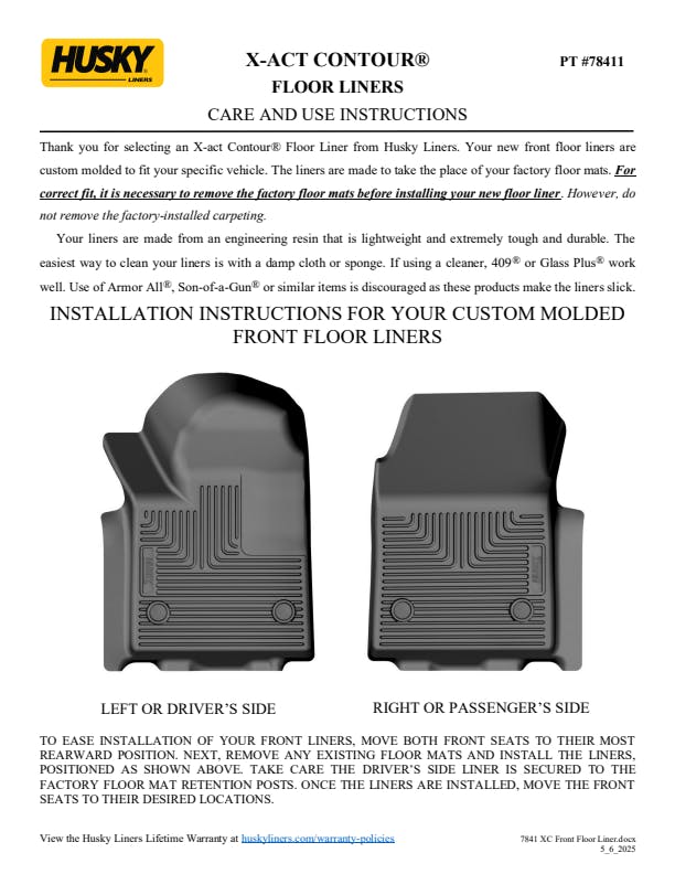 Nothing fits your vehicle better or protects longer than Husky X-act Contour?. These liners combine laser-scanned, exact fit with a no-slip, DuraGrip? surface and a softer feel. Plus, the rock-solid stability delivered by your vehicle?s factory retention posts, and our StayPut? Nibs for a no-slip, no-slide, surface with absolutely zero compromise in protection. They?re built to stand up to whatever you?re laying down? including chemicals like battery acid and oil, with our FormFit Edge? to keep whatever spills contained for easy cleanup. Available in black. Built for a lifetime of rugged abuse, warrantees the same.